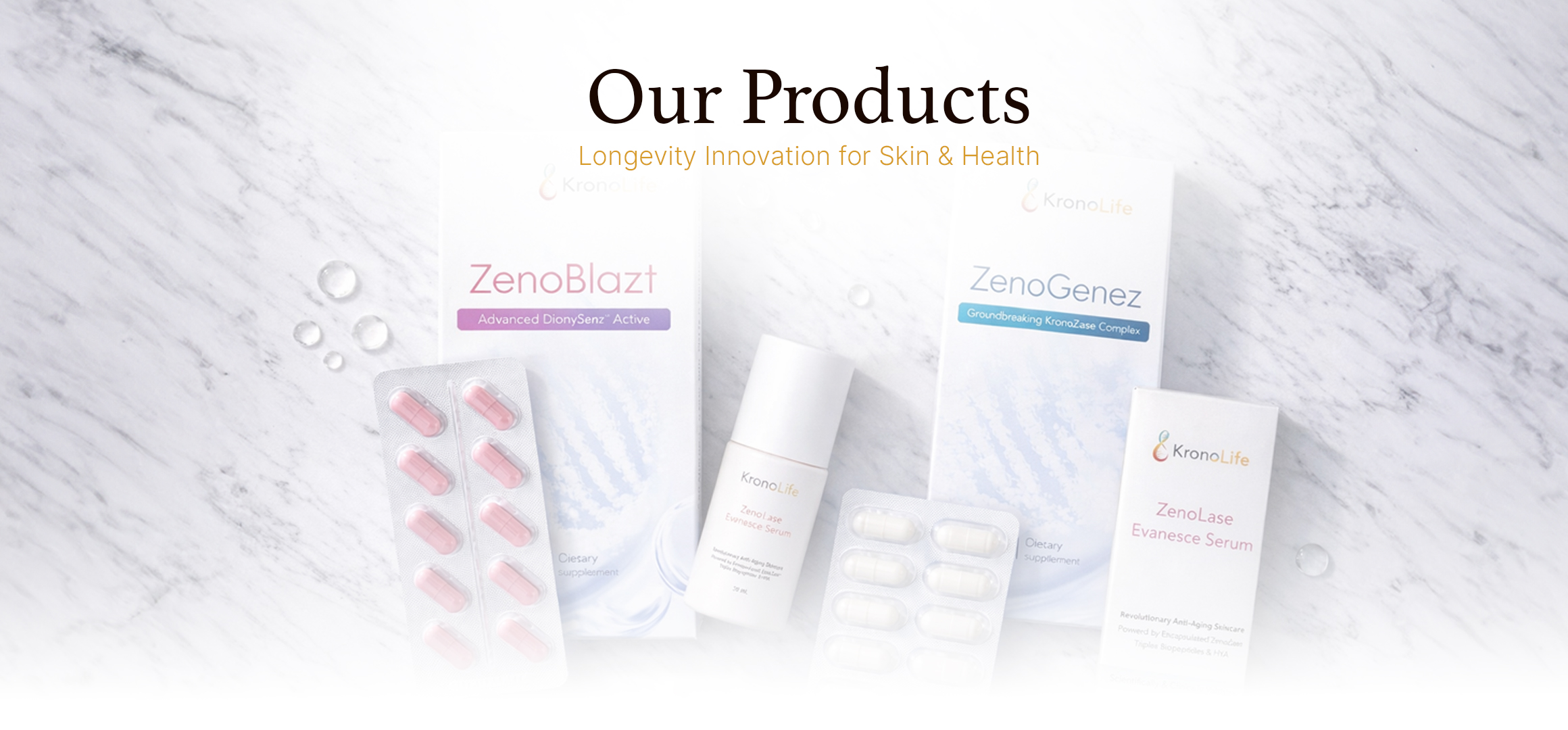 ผลิตภัณฑ์ของ KronoLife พัฒนาจาก Longevity Science ครอบคลุมทั้งการดูแลผิว (Skincare) และผลิตภัณฑ์เสริมอาหาร (Supplements) ทุกผลิตภัณฑ์พัฒนาบนพื้นฐานงานวิจัย และมีผลการทดสอบรองรับเพื่อยืนยันแนวคิดและประสิทธิภาพ